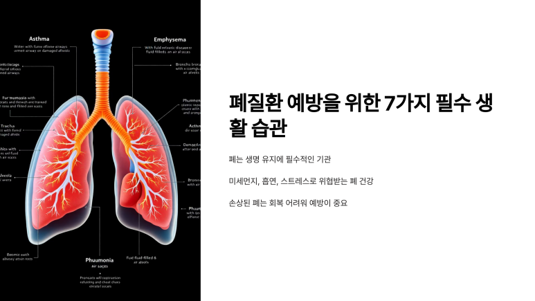 폐는 우리가 호흡을 통해 산소를 공급받고, 이산화탄소를 배출하는 생명 유지에 필수적인 기관입니다. 하지만 미세먼지, 흡연, 스트레스 등 여러 외부 요인으로 인해 폐 건강은 점점 위협받고 있습니다. 폐는 한번 손상되면 회복이 쉽지 않기 때문에, 평소 꾸준한 관리와 예방이 무엇보다 중요합니다. 이번 글에서는 폐질환을 예방하기 위한 7가지 필수 생활 습관을 자세히 알아보겠습니다.