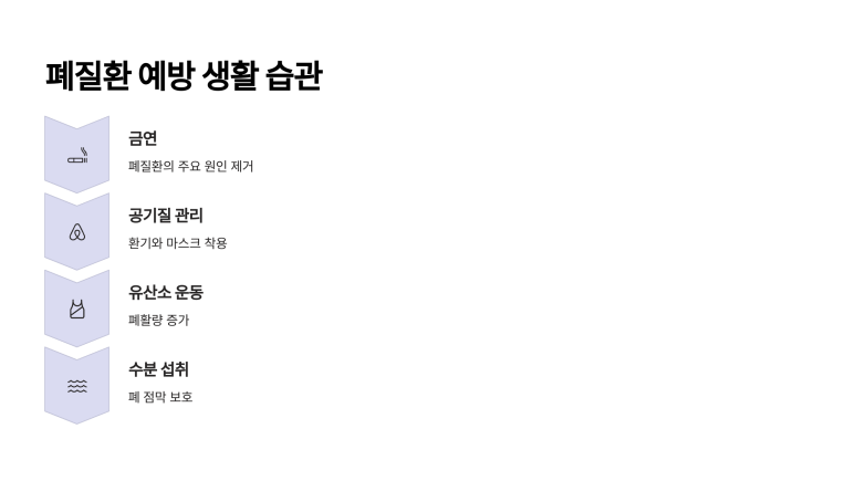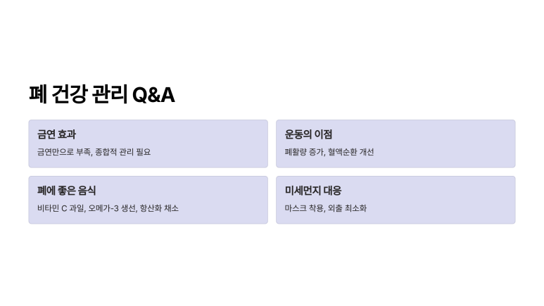 A1. 금연은 폐질환 예방에 가장 효과적이지만, 추가로 공기질 관리, 규칙적인 운동, 건강한 식습관 등이 함께 이루어져야 더욱 효과적인 예방이 가능합니다.